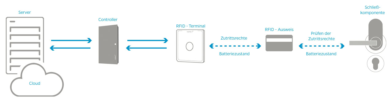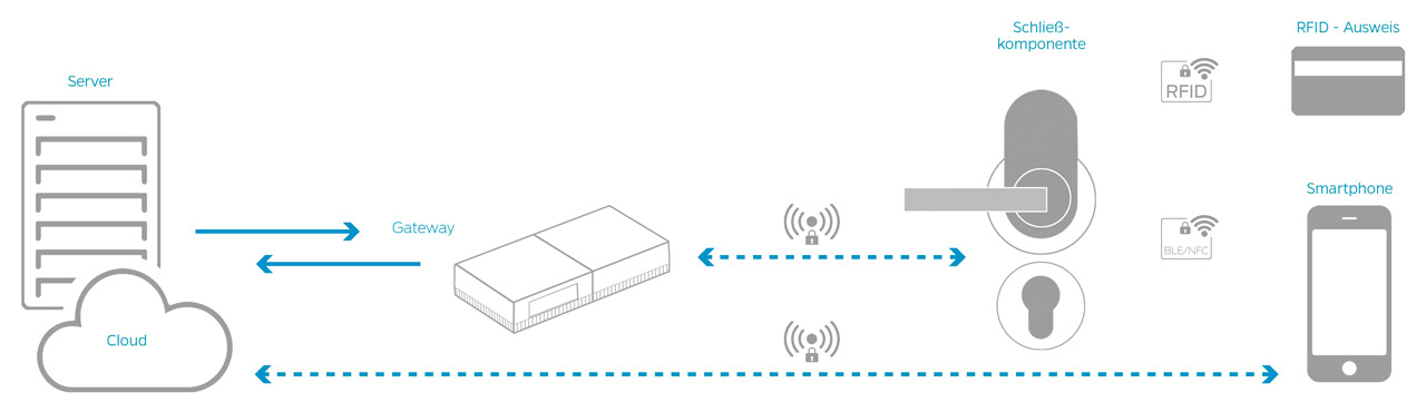 Kabellose Systeme bieten maximale Flexibilität und lassen sich schnell und unkompliziert in bestehende Infrastrukturen integrieren. Sie sind ideal für Einsatzorte ohne Stromanbindung oder mit hohem Installationsaufwand. Die Verwaltung der Zutrittsrechte erfolgt zentral in der Steuerungssoftware; Zutrittsberechtigungen können jederzeit vergeben oder unmittelbar entzogen werden.