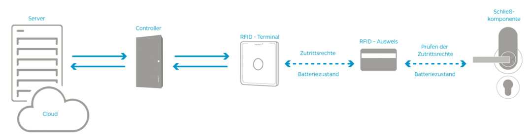 De online-terminals schrijven met NetworkOnCard individuele toegangsrechten op de passen van de gebruikers en geven zo de offline-sluitcomponenten hun rechten. De passen zijn beschikbaar in creditcardformaat of als sleutelhanger. Bij de eerste transactie aan een online-terminal worden de rechten geactiveerd. NetworkOnCard integreert zo offline-sluitcomponenten in een bestaande beveiligingsoplossing. Ze zijn bijvoorbeeld geschikt voor kantoor-, entree- en buitendeuren, garagedeuren, lockers en meubelkasten.